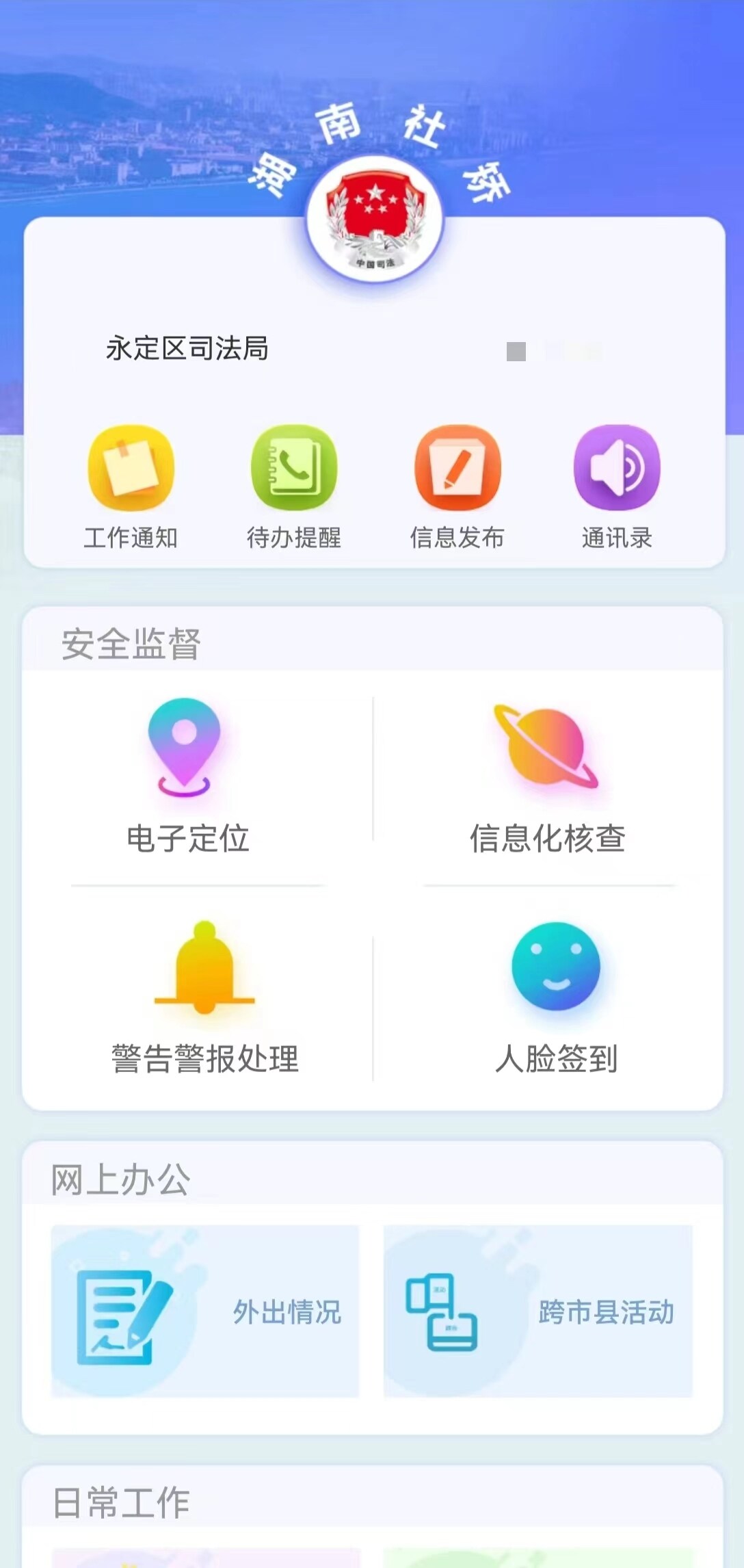 社区矫正对象在永定区社区矫正中心报到时,永定区司法局社区矫正工作人员都会要求他们在手机端下载“在矫通”APP,每天定时完成人脸识别“打卡定位”,搭建起高效智慧管控的电子围栏。永定区司法局安排专人每天定时定点在电脑端或手机端核查相关信息,一旦发现社区矫正对象不在规定区域活动,工作人员将迅速启动“保证人+村(社区)干部+志愿者+工作人员”的四级联动机制,严防社区矫正对象脱管、漏管。
